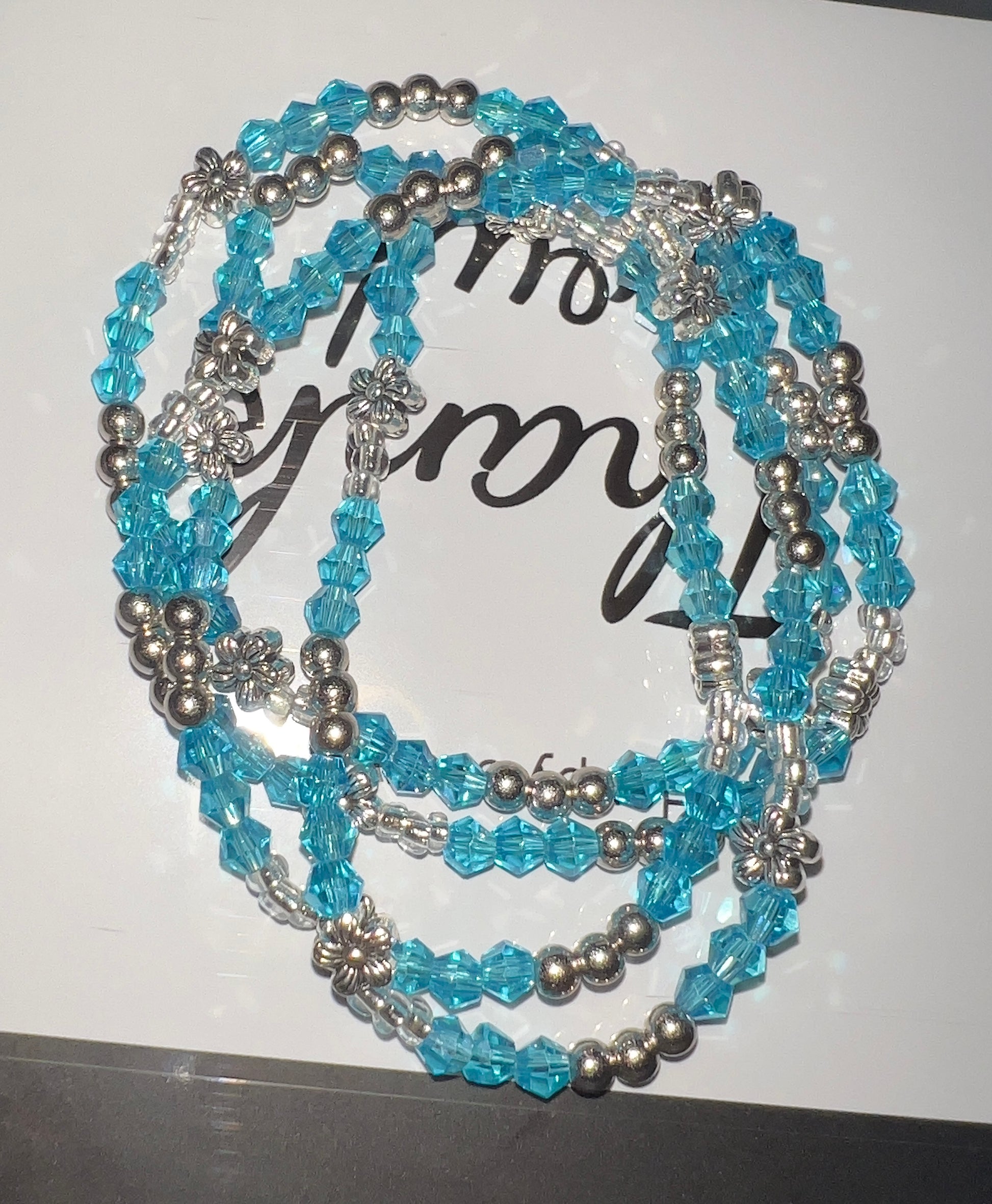This handmade cerulean bracelet features a harmonious blend of three bead types—crystal, plastic, and silver-plated beads. With its celestial-inspired design, it evokes a sense of calm while adding a refined, elegant touch to your everyday style. Versatile and timeless, it can be worn on multiple occasions and pairs beautifully with a watch or a chain bracelet.